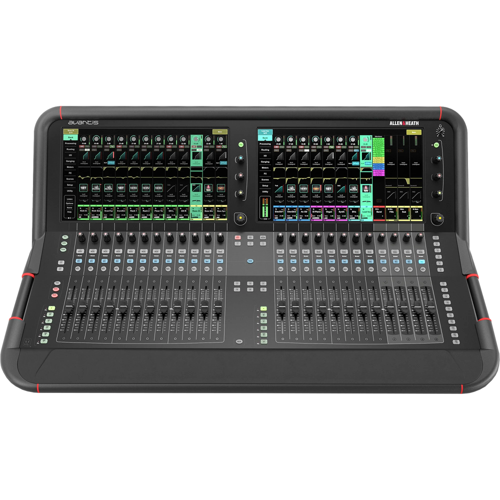 Allen & Heath Avantis, SQ5, Midas M32, and Waves LV1 — touring-grade platforms with stage boxes, digital snakes, and redundant I/O.